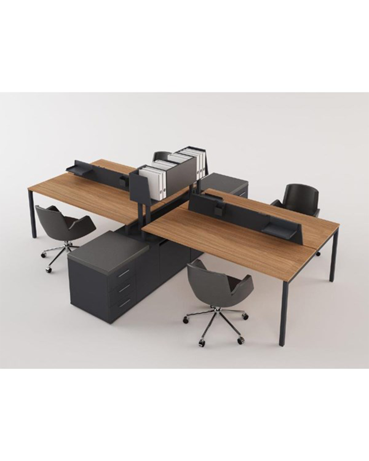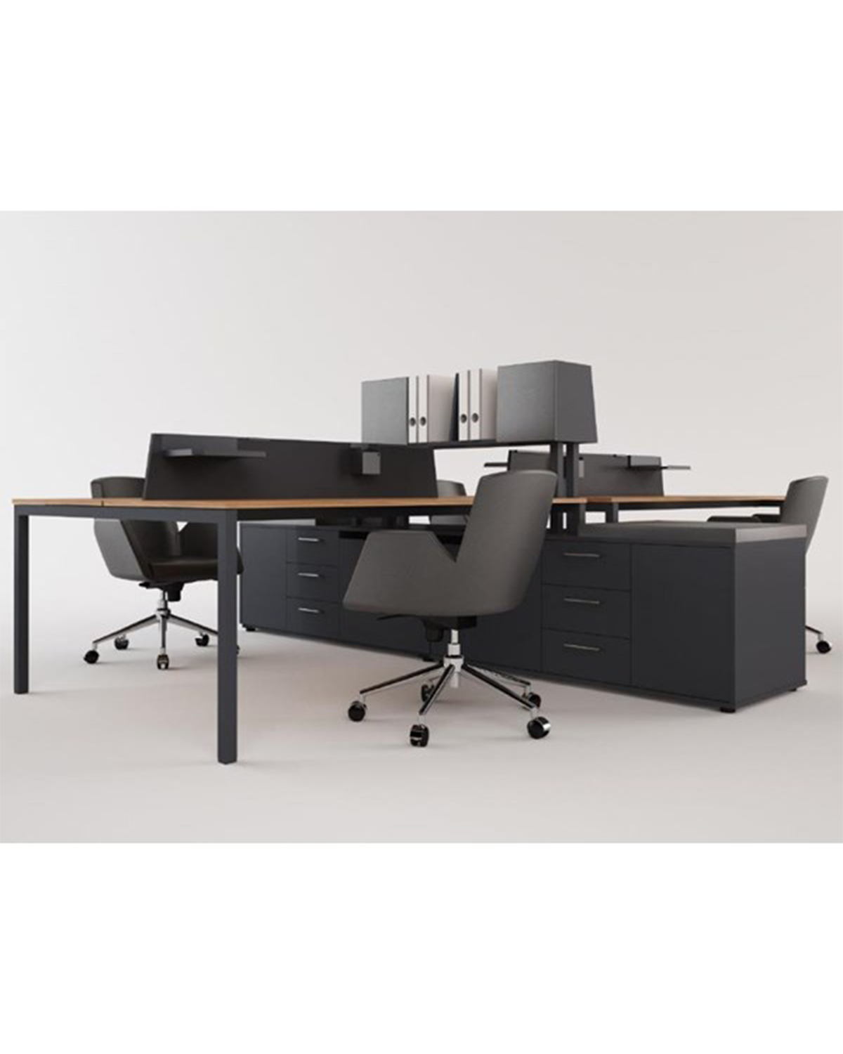 ATLANTIS A45 WORKSTATION FEATURES PROFILE LEGS AND A DOUBLE-SIDED SIDE CABINET, PROVIDING YOU WITH EXTRA STORAGE SPACE. IT IS MADE OF MELAMINE MATERIAL AND CAN BE PRODUCED TO FIT YOUR OFFICE DIMENSIONS.